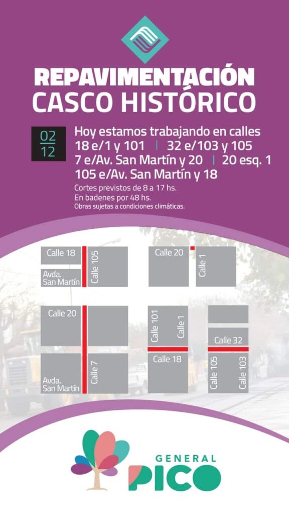 El municipio local informa los cortes de calles que se efectuarán durante el día de hoy, VIERNES 2 DE DICIEMBRE, en el marco de la obra de reconstrucción y repavimentación de 267 cuadras de asfalto comprendidas dentro del viejo casco urbano.