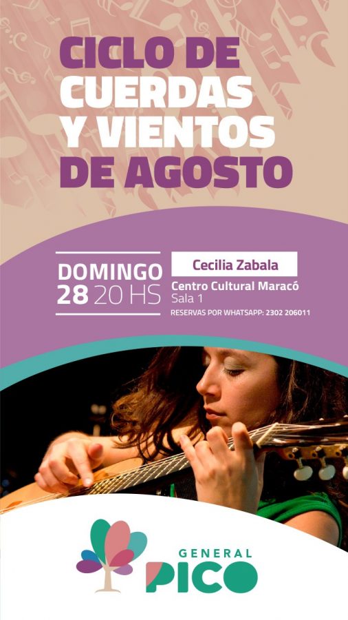 La Municipalidad de General Pico realizará el próximo fin de semana, domingo 28 a las 20:00, la última noche del ciclo de la mano de la cantante Cecilia Zabala, en la Sala 1 del Centro Cultural Maracó, ubicado en calle 17 N° 560, con entrada libre y gratuita.