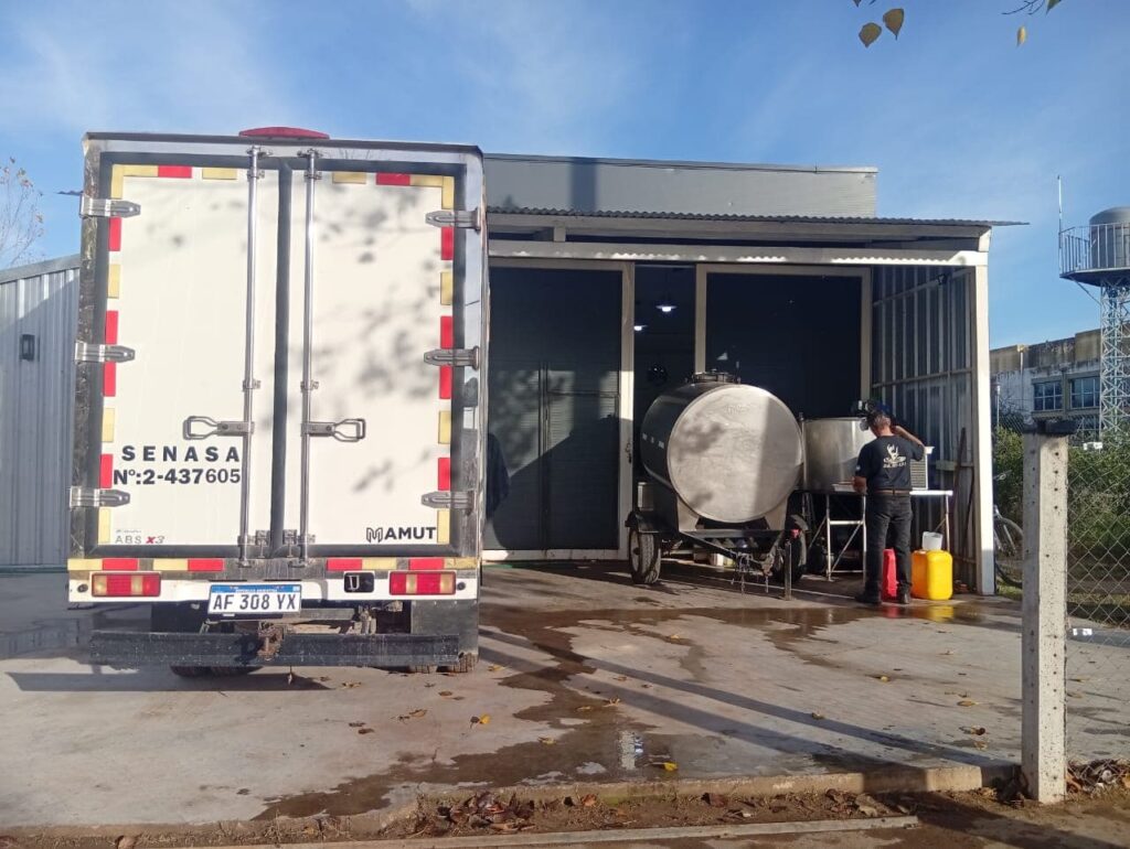 La leche se busca en el tanque de cada productor utilizando un tanque cisterna con aislamiento térmico. La transferencia se realiza desde el tanque enfriador del tambo mediante una bomba con turbina de acero inoxidable.