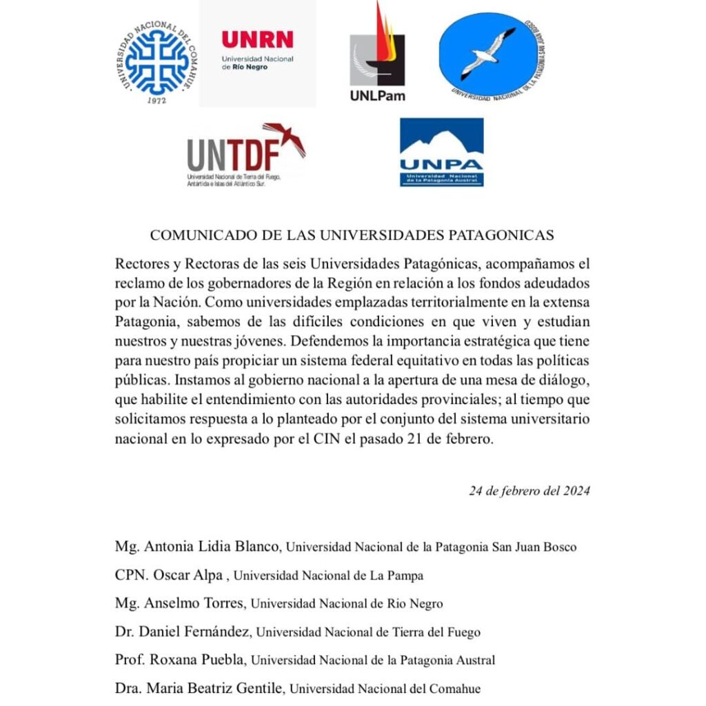 Como universidades emplazadas territorialmente en la extensa Patagonia, sabemos de las difíciles condiciones en que viven y estudian nuestros y nuestras jóvenes. Defendemos la importancia estratégica que tiene para nuestro país propiciar un sistema federal equitativo en todas las políticas públicas. Instamos al gobierno nacional a la apertura de una mesa de diálogo,que habilite el entendimiento con las autoridades provinciales; al tiempo que solicitamos respuesta a lo planteado por el conjunto del sistema universitario.