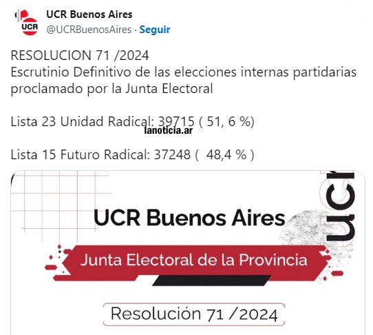 Según el informe oficial, la lista 23 Unidad Radical se impuso con un total de 39.715 votos, lo que representa el 51.60% del total, superando a la lista opositora, que obtuvo 37.248 votos. Con esta victoria, Miguel Fernández asumirá la presidencia del radicalismo bonaerense por los próximos dos años, tal como se había anticipado en el escrutinio provisorio.
